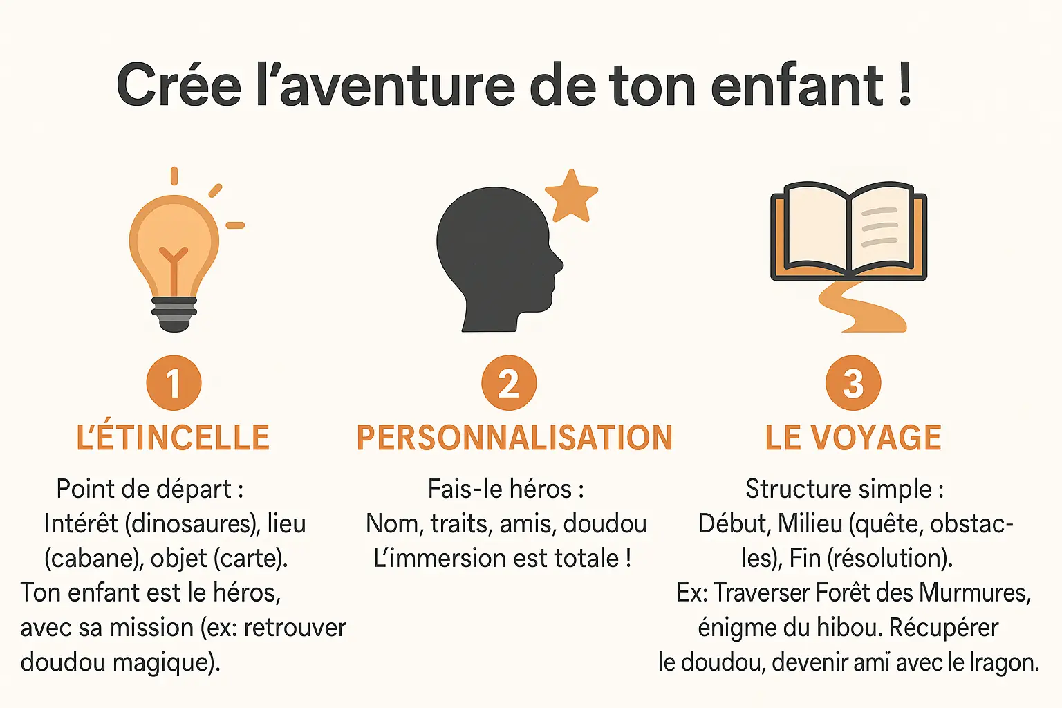 Et si la plus belle des aventures Ă©tait celle que TU inventes pour ton enfant ? Pas besoin d’ĂȘtre un grand Ă©crivain : quelques Ă©tapes clĂ©s suffisent pour faire naĂźtre un rĂ©cit magique. PrĂȘt Ă transformer l’ordinaire en extraordinaire ? Savez-vous que les enfants retiennent 30% mieux les leçons intĂ©grĂ©es Ă des histoires personnalisĂ©es ? Câest lâoccasion idĂ©ale pour transmettre des valeurs tout en sâamusant, car lâĂ©motion suscitĂ©e ancre les apprentissages de maniĂšre durable.